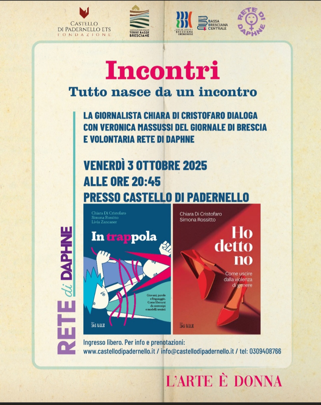 "Incontri" 3 ottobre 2025 "Prevenzione Donna" 3 ottobre 2025 "Io arrivo prima..." - 5 ottobre 2025 "L'ARTE E' DONNA" - RETE DI DAPHNE 5 ottobre 2025