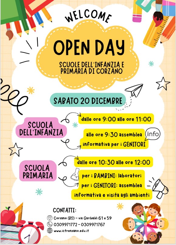 OPEN DAY SABATO 20 DICEMBRE 2025 Scuola dell'Infanzia di Corzano Scuola Primaria di Corzano Scuola Primari di Trenzano Scuola Primaria di Cossirano